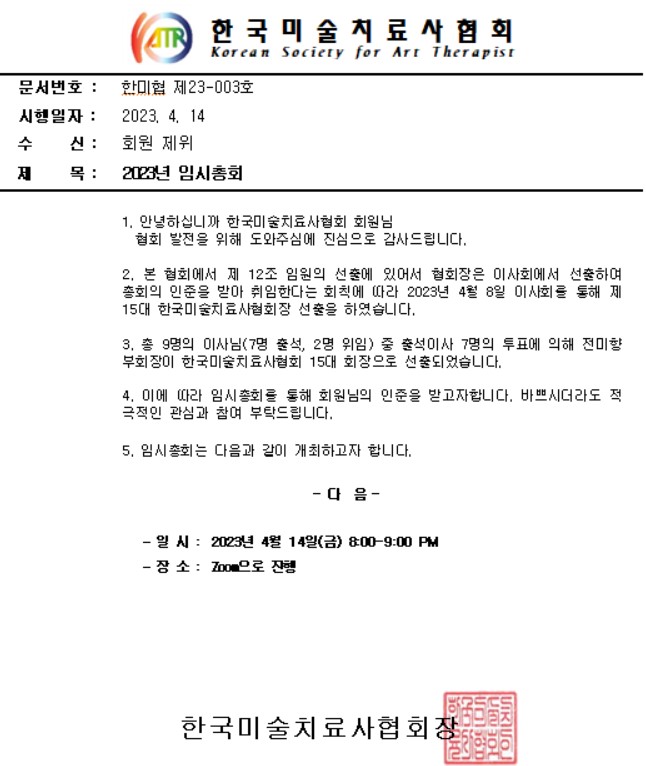 주제: 2023년 한국미술치료사협회 임시총회